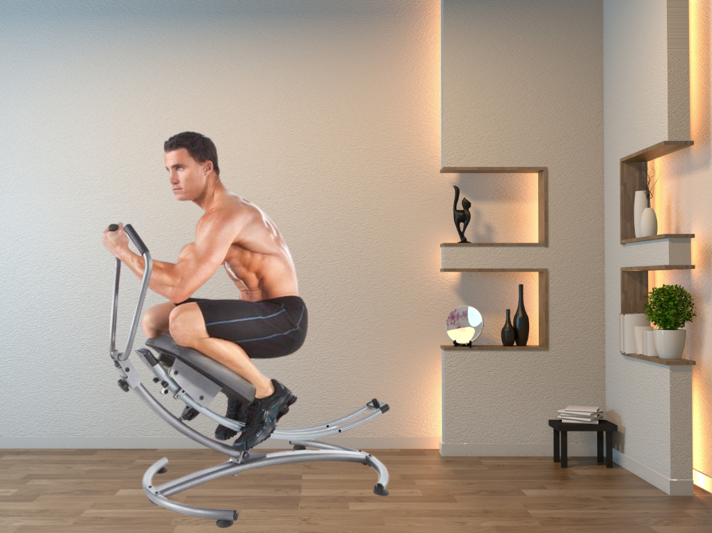 He has a smooth rolling wheel slider that glides along the curved frame. You just have to sit in the right posture and glide up and down for an effective workout session.
