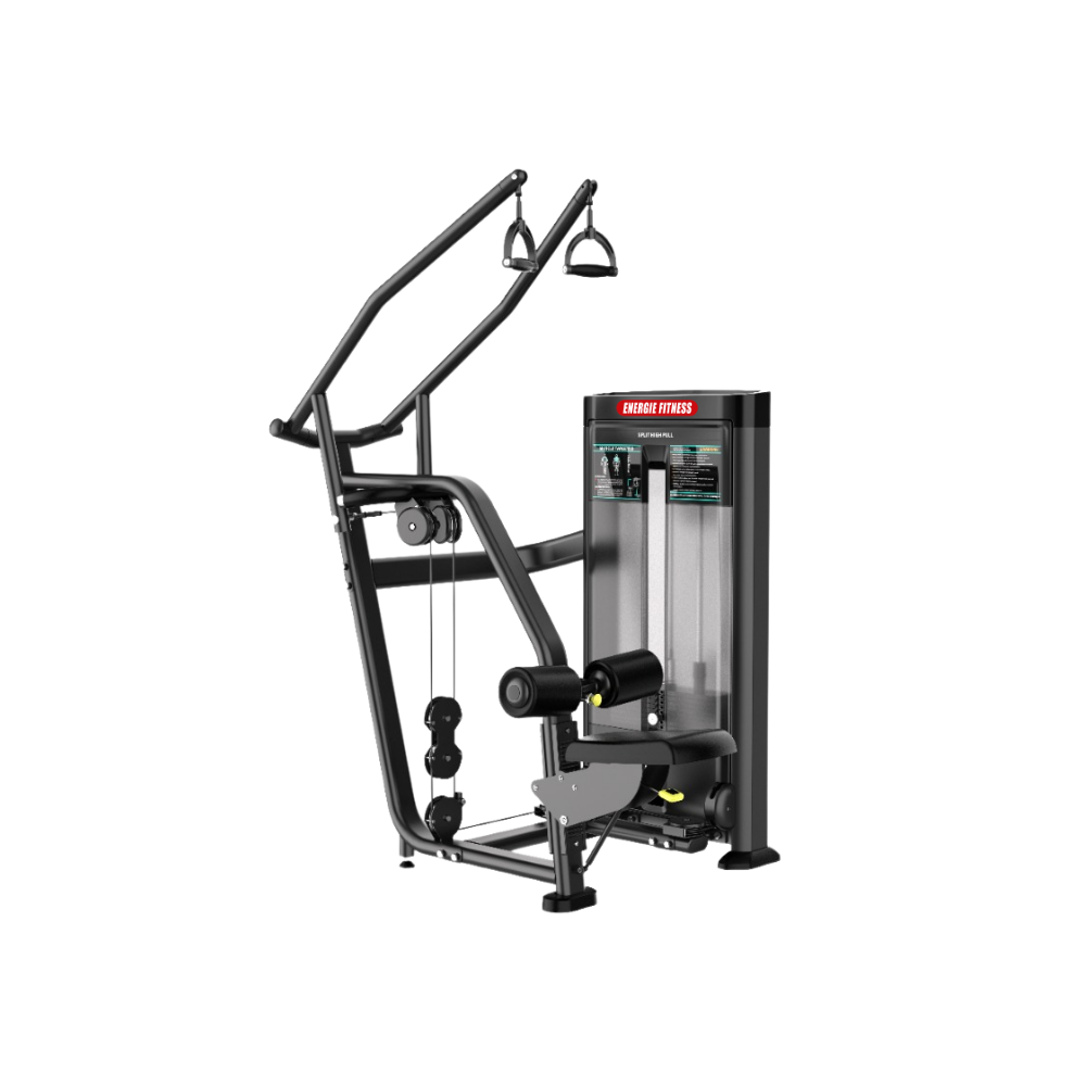 The lat pulldown machine with a weight stack provides adjustable resistance for controlled back, shoulder, and arm workouts, helping to build strength, improve posture, and enhance upper-body muscle definition.