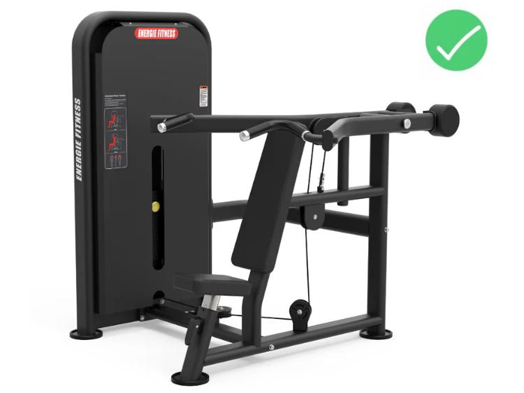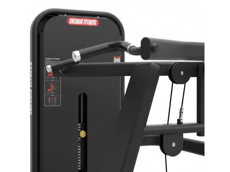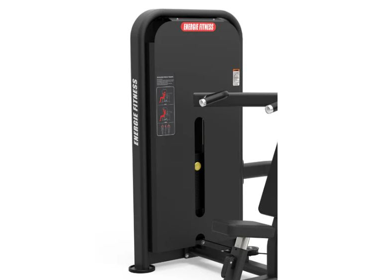 Energie Fitness shoulder press equipment along with the other commercial equipment, features strong front and back weight stack shrouds for injury prevention. These shrouds not only enhance the safety factor but also make it look cleaner and different from other setups.