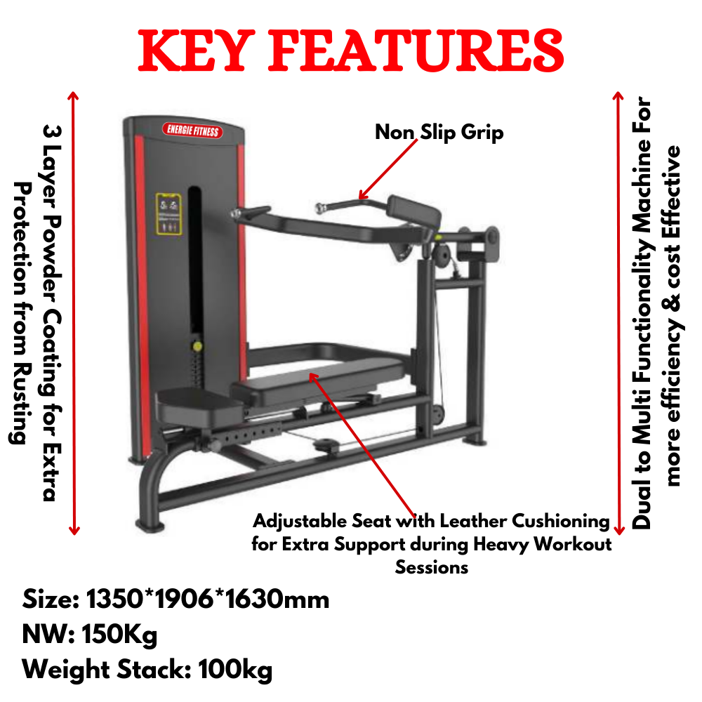 Our commercial multi-press offers easy adjustments for user comfort. Beginning from pin loading for weight capacity to quick seat adjustment, it features user-friendly adjustments.