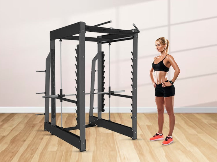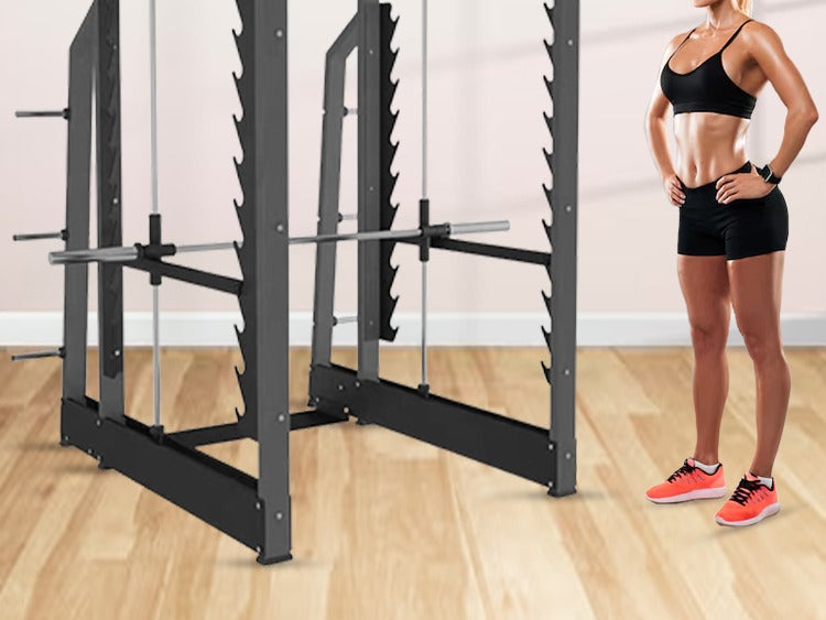 This premium commercial Smith machine has an interlocking system for advanced safety control. Users can stick the barbell rods between the grooved safety hooks while they relax their bodies. The design of these books also facilitates quick lift motion for advanced training.