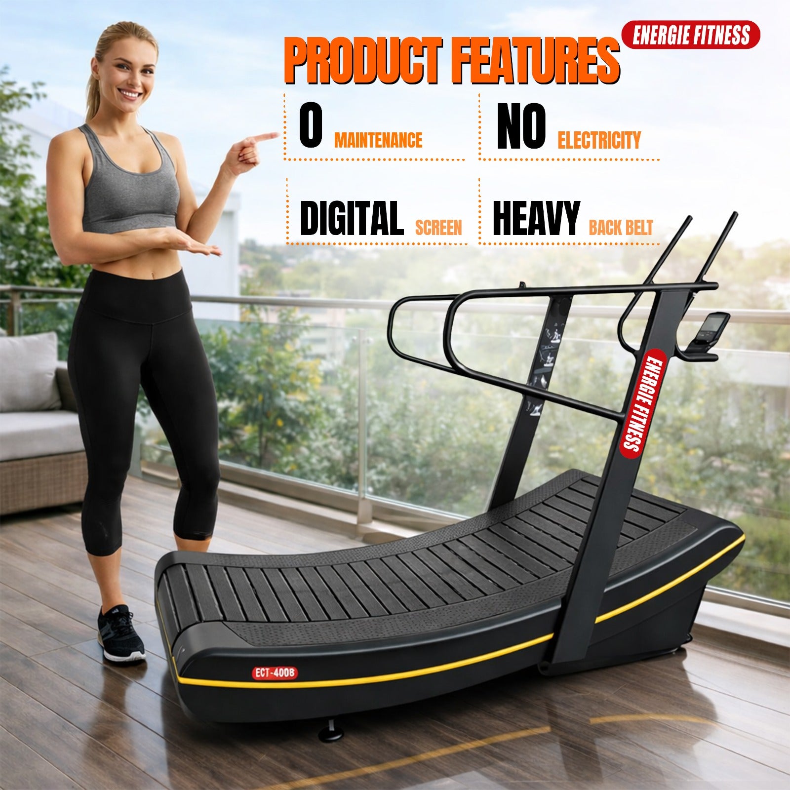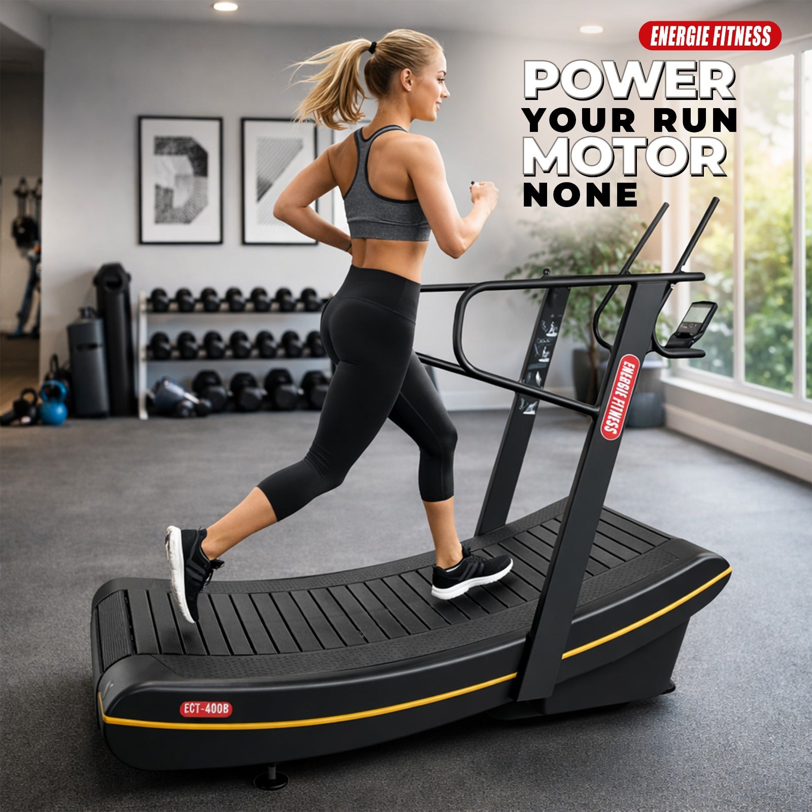 The ECT-400B Lite Curve treadmill machine for sale is a high-quality gym machine that operates on zero power. This curved treadmill is perfect for commercial gyms where people require versatility for cardio.